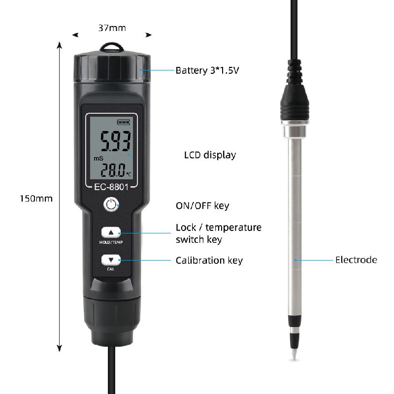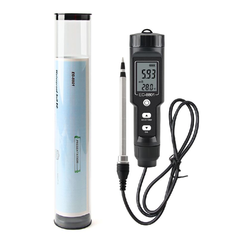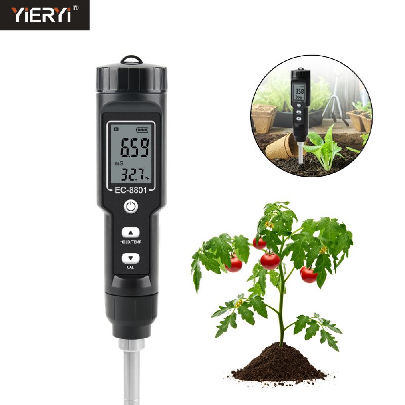A 2-in-1 digital soil tester that measures soil electrical conductivity index (EC) and soil temperature. The tester measures EC in the range of 0.00-10.00ms/cm and temperature in the range of -30℃ to 80℃. The EC value of the soil is an index to determine the soil water-soluble salts and a factor to determine whether the salt ions in soil limit crop growth.