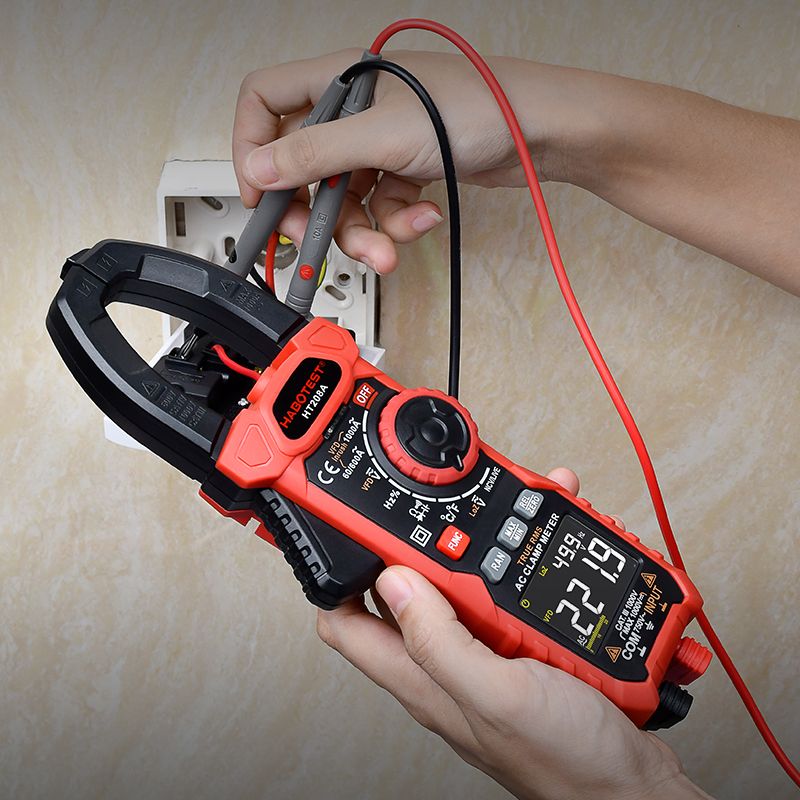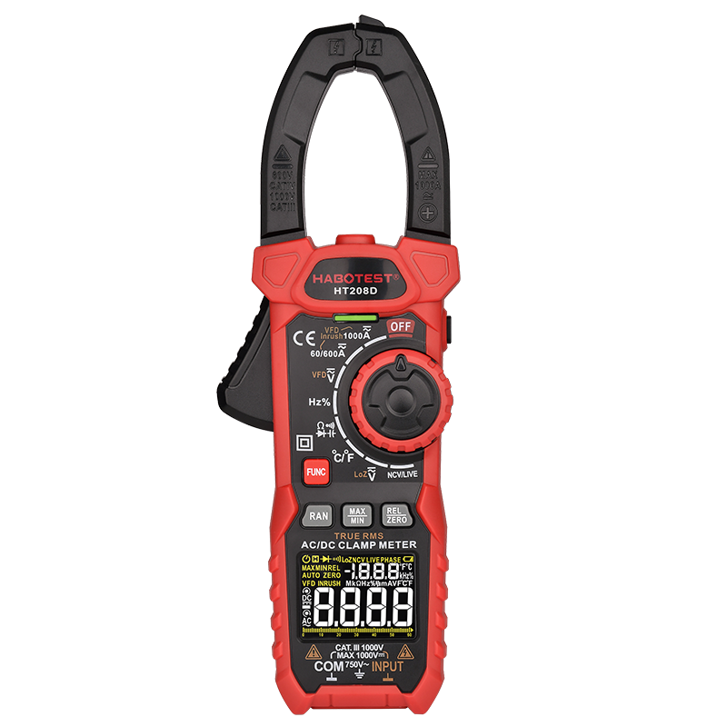 The HABOTEST HT208D digital clamp meter is a multifunctional device for measuring AC/DC current and voltage, frequency, resistance, temperature, power, capacity, load factor, diode and continuity test.