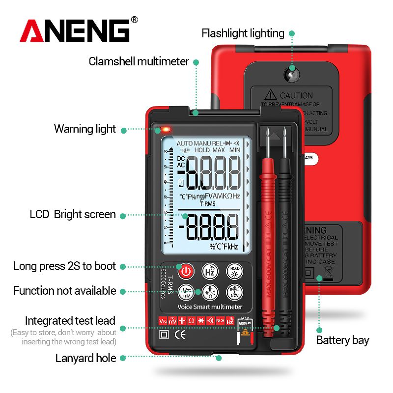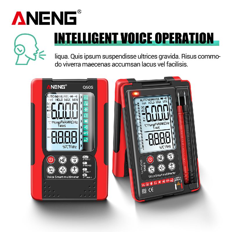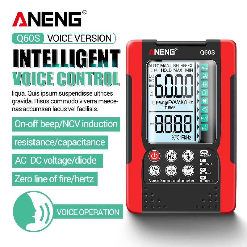 ANENG Q60S is a multifunction multimeter that features intelligent voice control to switch between commands. This effectively frees the hands and makes it easier to work with the device.