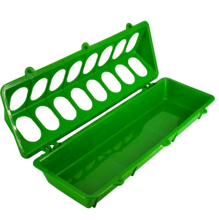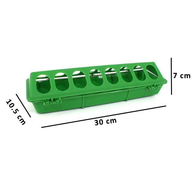 Linear feeder for chickens with the following dimensions: length 30cm, height 7cm and width 10.5cm. It is a useful tool for feeding poultry in a controlled and organized manner.